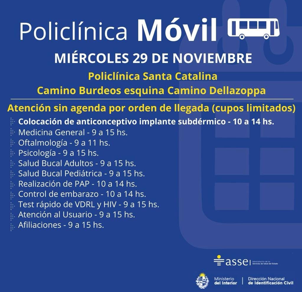 El 29 de noviembre, la Policlínica Móvil se ubicará en la policlínica Santa Catalina, en Camino Burdeos esquina Camino Dellazoppa. La atención será sin cita previa y estará sujeta a cupos limitados, siguiendo el orden de llegada. Aquí se detalla la programación y los servicios disponibles para ese día.