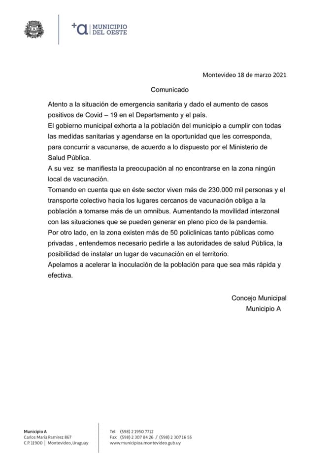 El Concejo Municipal del Municipio A publicó un comunicado en el que se expresó la preocupación por falta de vacunatorios en el territorio.