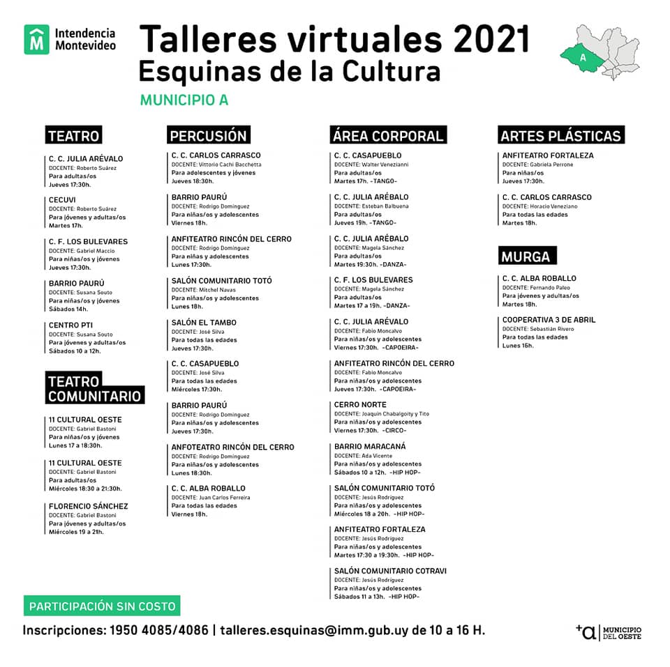 El Programa «Esquinas de la Cultura» difundió un listado de talleres virtuales para este 2021 dentro del territorio del Municipio A.
